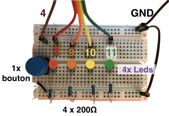 - 4 résistances de 200Ω à 400Ω (en fonction de vos LEDs)