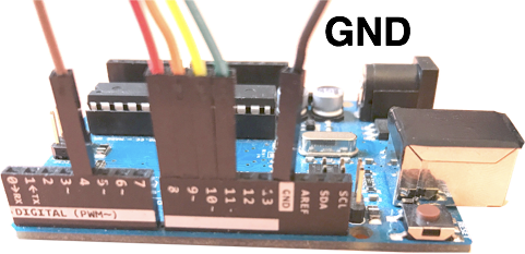 Dans nos cours, nous utilisons des Arduino Mega 2560. Le montage ci-dessous utilise les broches 4, 8, 9, 10 et 11 sur la Mega.