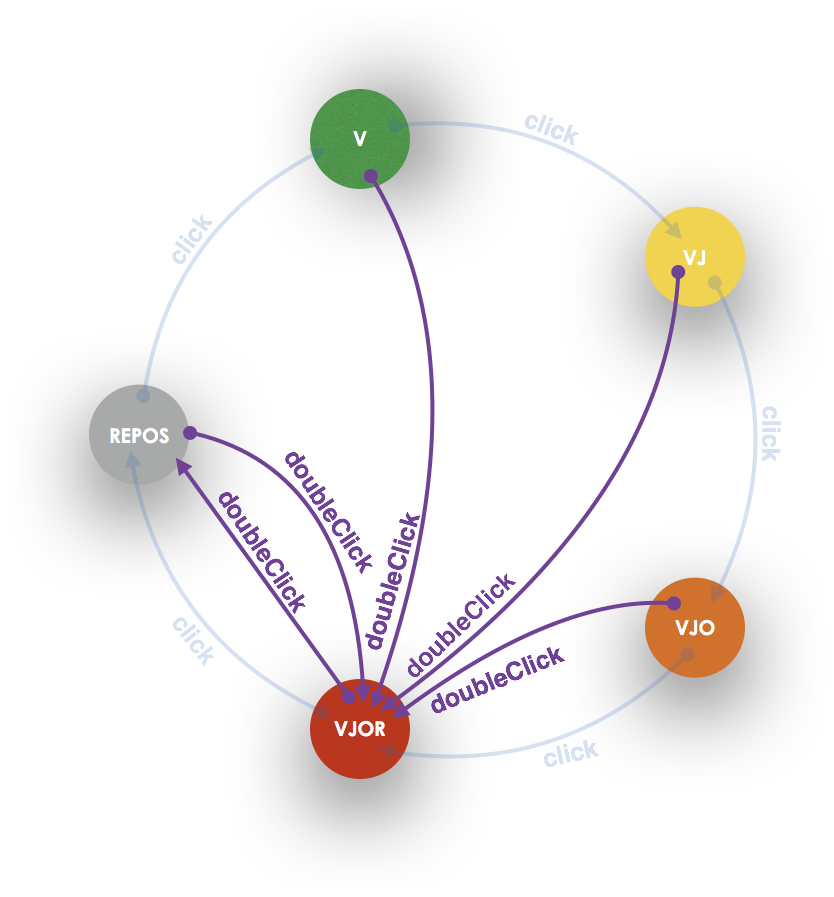Notre machine se complique donc un petit peu. On a un nouvel événement à prendre en compte, le double-clic, qui va générer de nouvelles transitions: une transition qui va de tous les états sauf "tout allumé" vers l'état "tout allumé", et une transition de "tout allumé" vers l'état de repos en cas de double-clic.